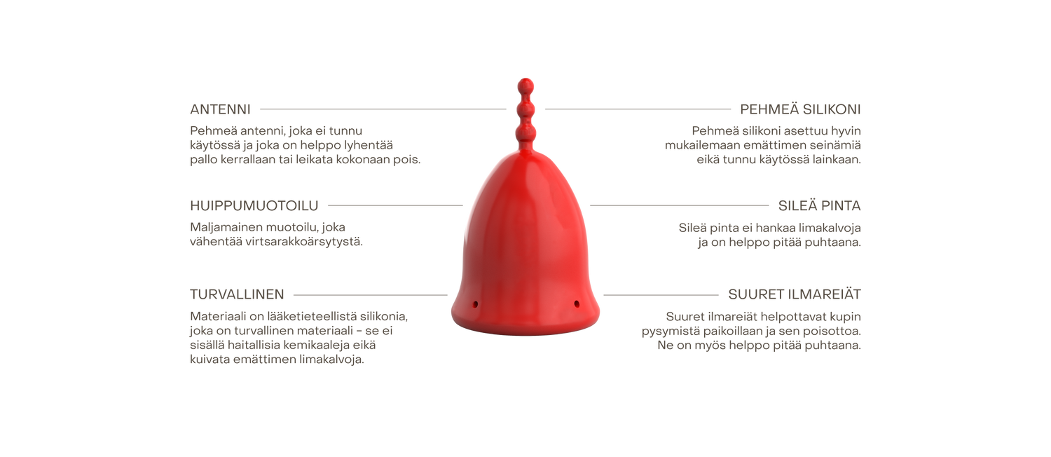 - Kolme eri kokoa. Emme ole kaikki samanlaisia, useampi eri koko auttaa löytämään itselle istuvimman kuukupin. Koko kannattaa ensisijaisesti valita vuodon määrän mukaan.